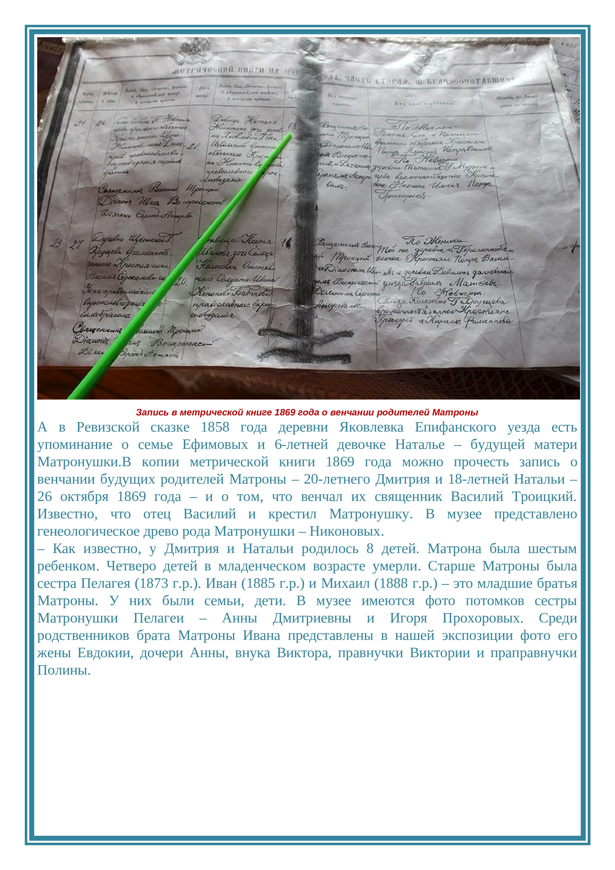 Однажды Матрона говорит матери: «Мама, готовься, у меня скоро будет свадьба». Мать рассказала священнику, тот пришел, причастил девочку (он всегда причащал ее на дому по ее желанию). И вдруг через несколько дней едут и едут повозки к дому Никоновых, идут люди со своими бедами и горестями, везут больных, и все почему-то спрашивают Матронушку. Она читала над ними молитвы и очень многих исцеляла. Мать ее спрашивает: «Матрюшенька, да что же это такое?» А она отвечает: «Я же тебе говорила, что будет свадьба».