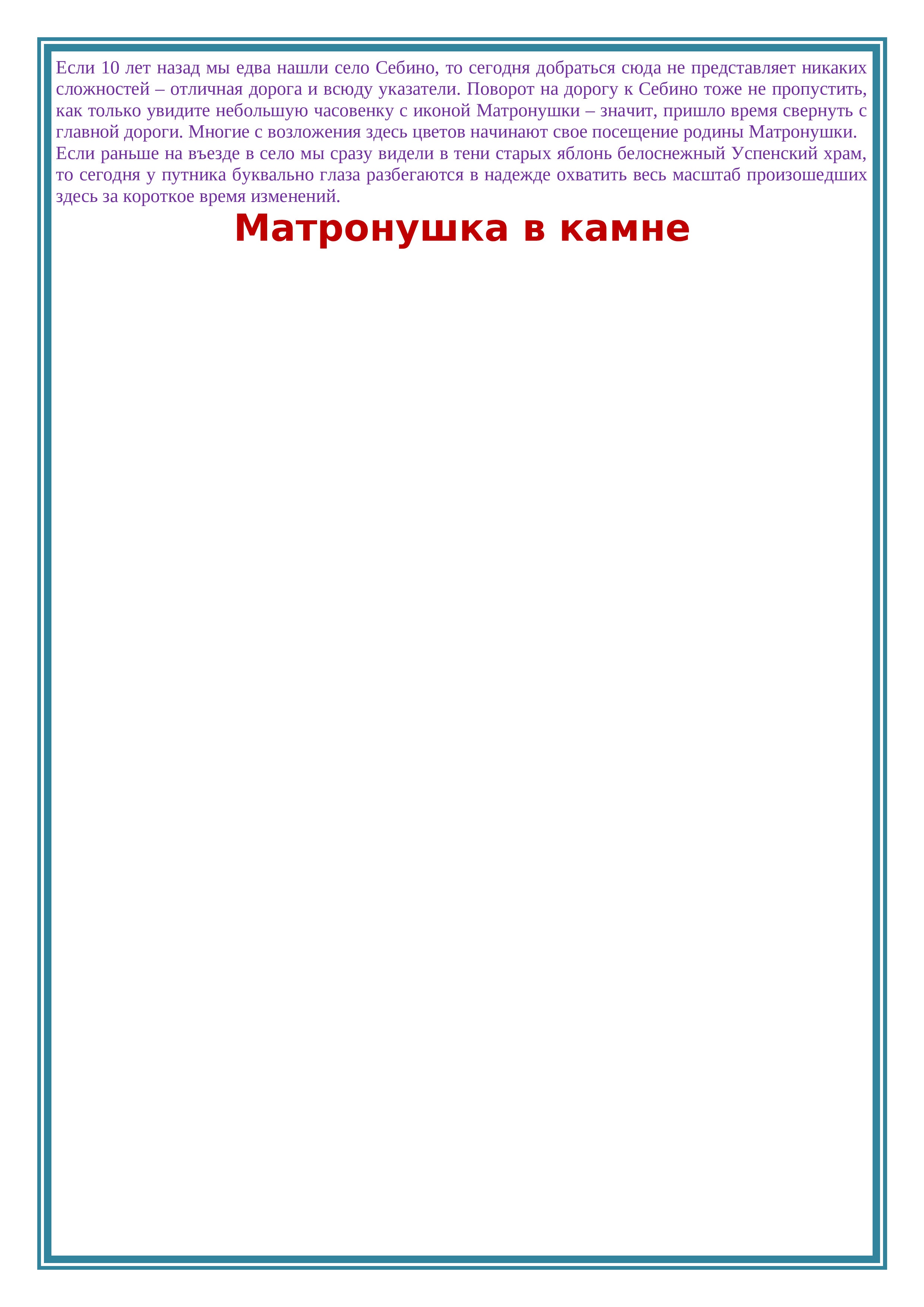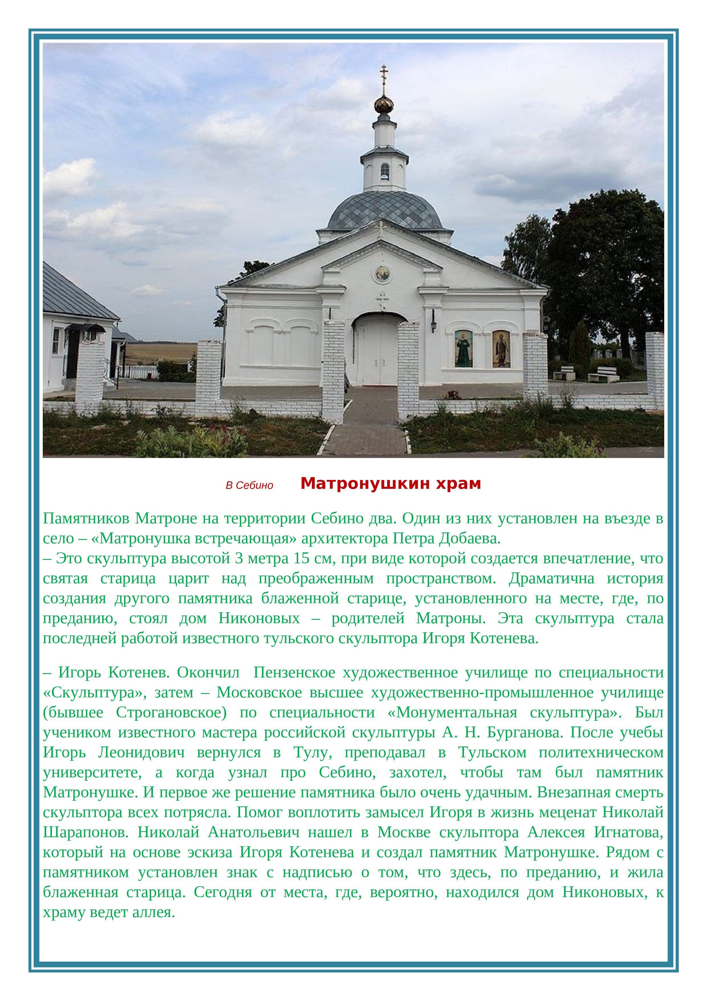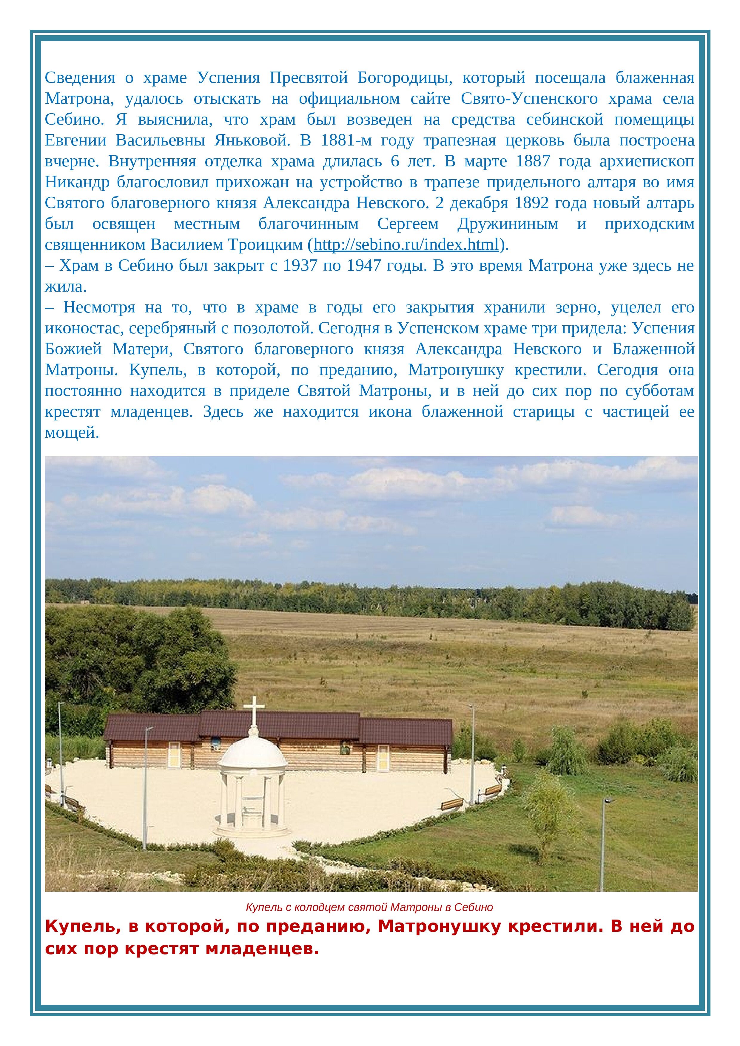 Односельчанка Матроны, Евгения Ивановна Калачкова, рассказывала, что перед самой революцией одна барыня купила дом в Себино, пришла к Матроне и говорит: «Я хочу строить колокольню».