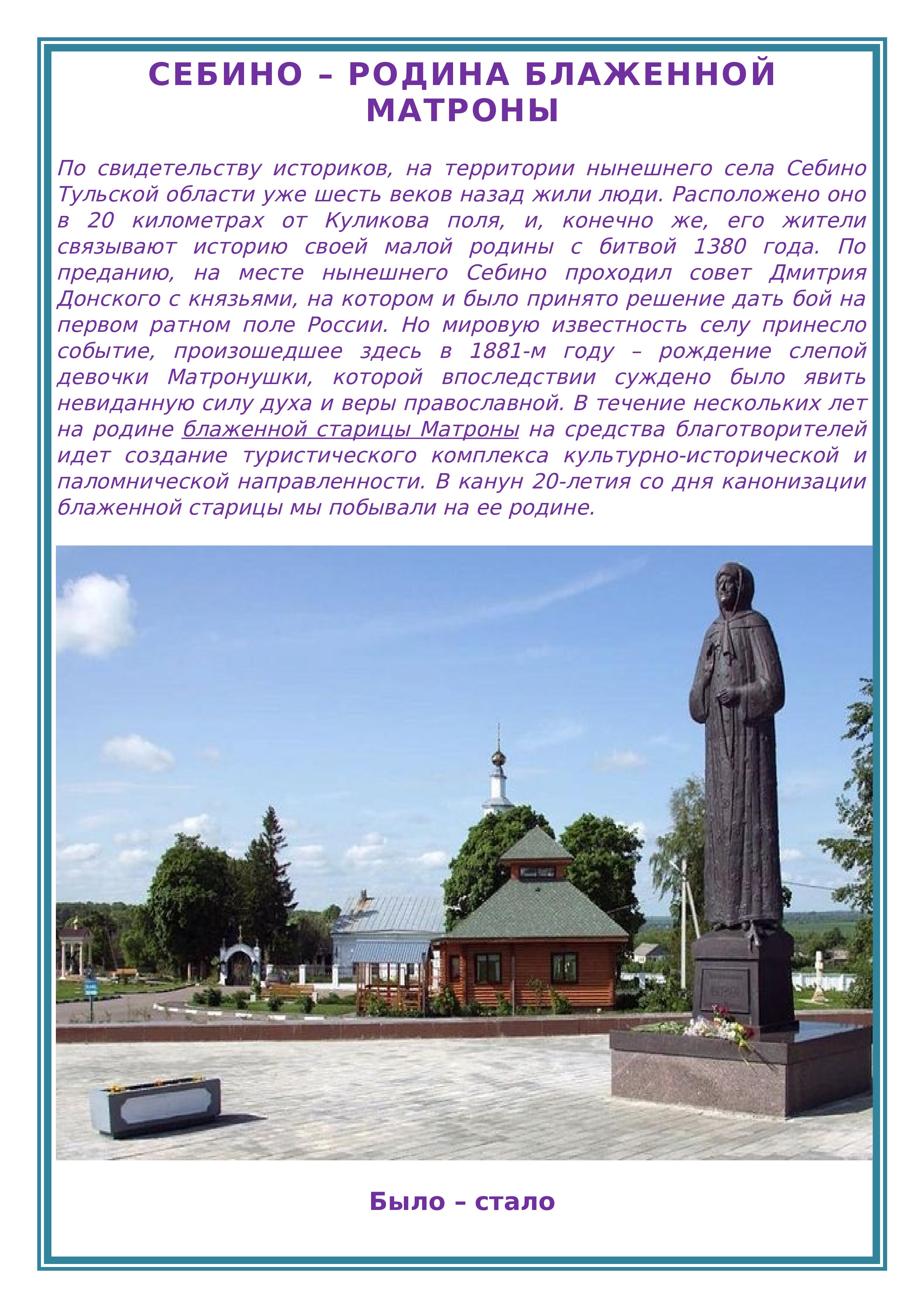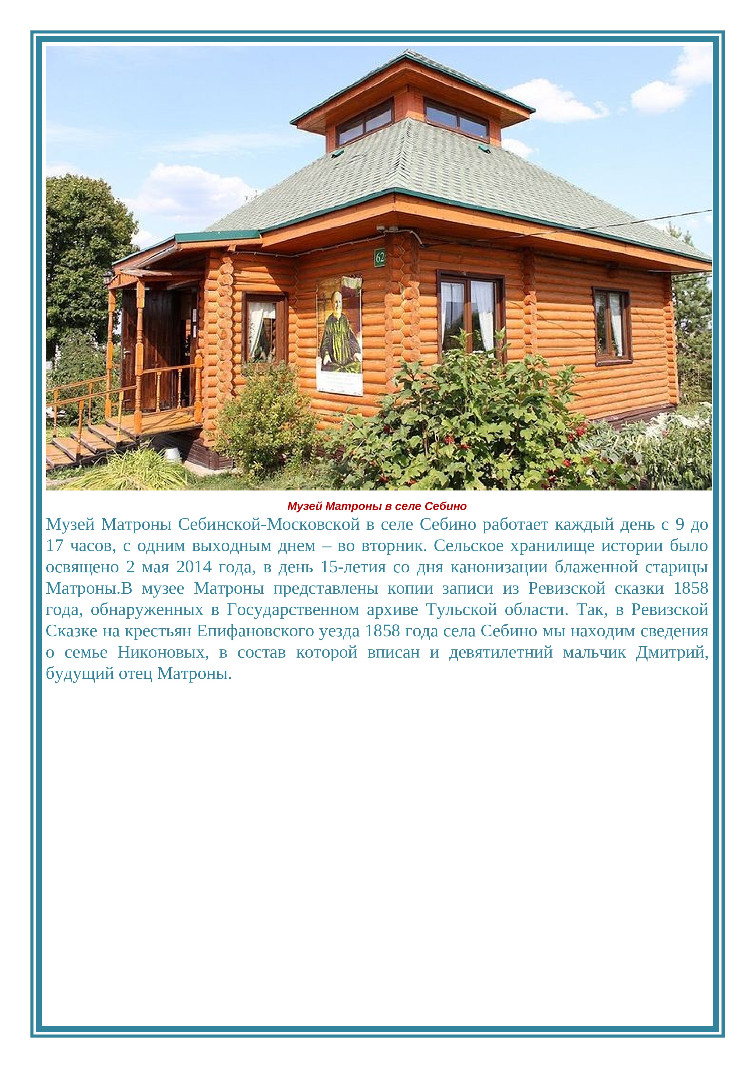 Родилась блаженная Матрона (Матрона Димитриевна Никонова) в 1881 году в селе Себино Епифанского уезда (ныне Кимовского района) Тульской губернии. Село это расположено километрах в двадцати от знаменитого Куликова поля. Родители ее — Димитрий и Наталия, крестьяне — были людьми благочестивыми, честно трудились, жили бедно. В семье было четверо детей: двое братьев — Иван и Михаил, и две сестры — Мария и Матрона. Матрона была младшей. Когда она родилась, родители ее были уже немолоды.