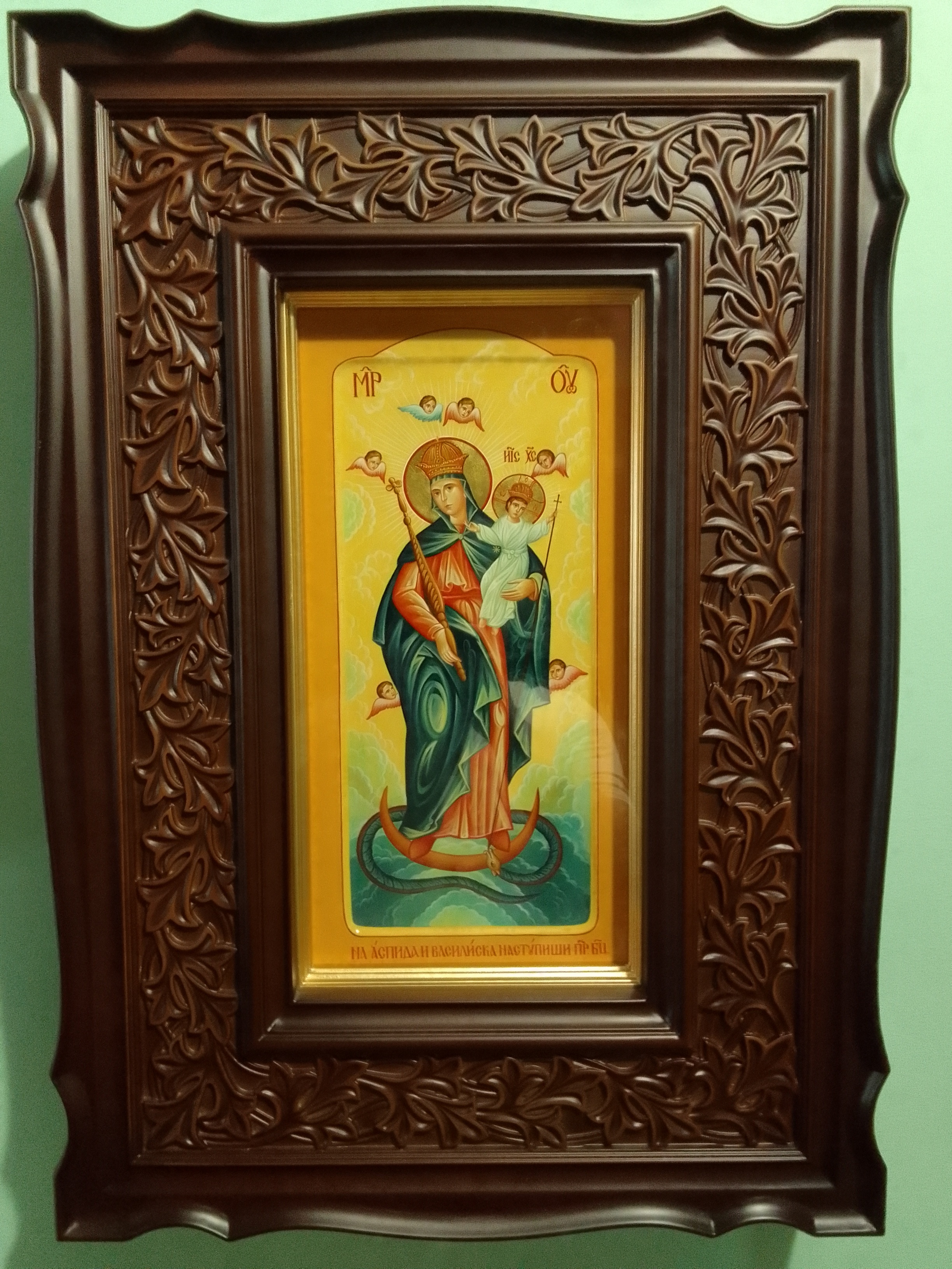 Икона Пресвятой Богородицы «На аспида и василиска наступиши» особо выделяется из всех икон редким письмом и широким резным кивотом. Подарена священником из северной части России. Располагается напротив иконостаса.