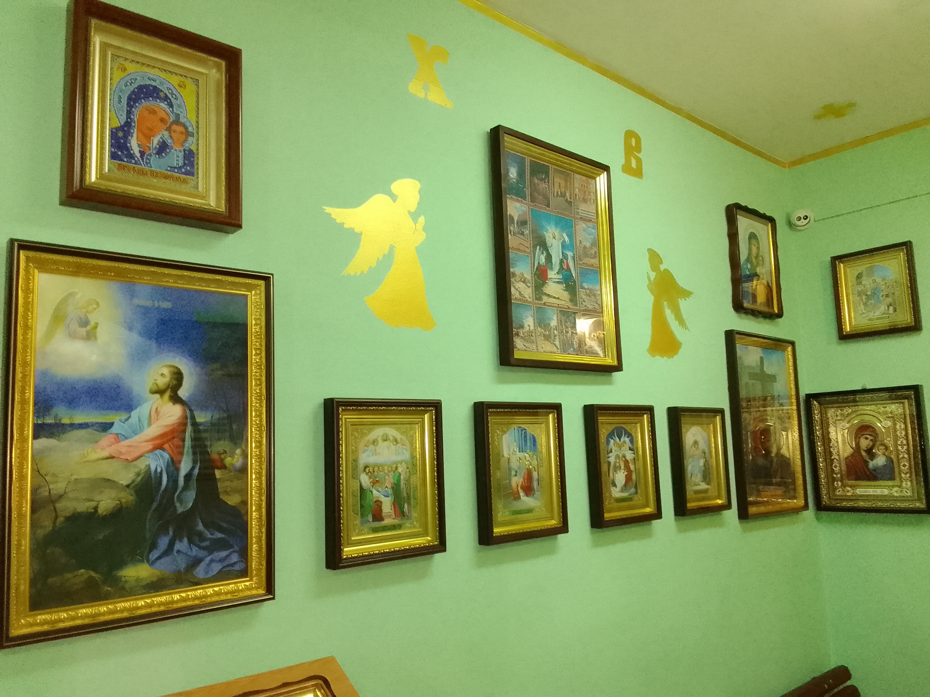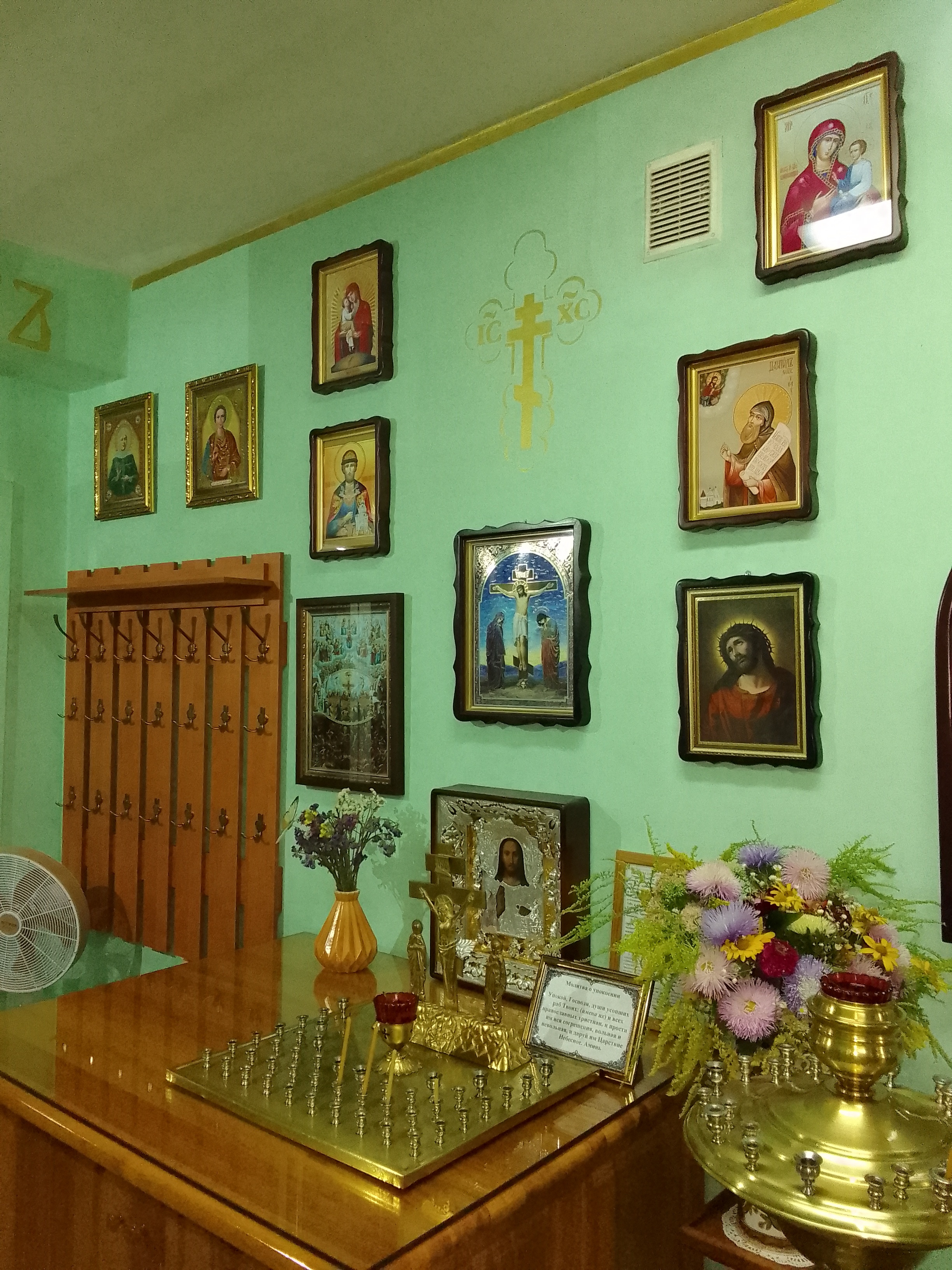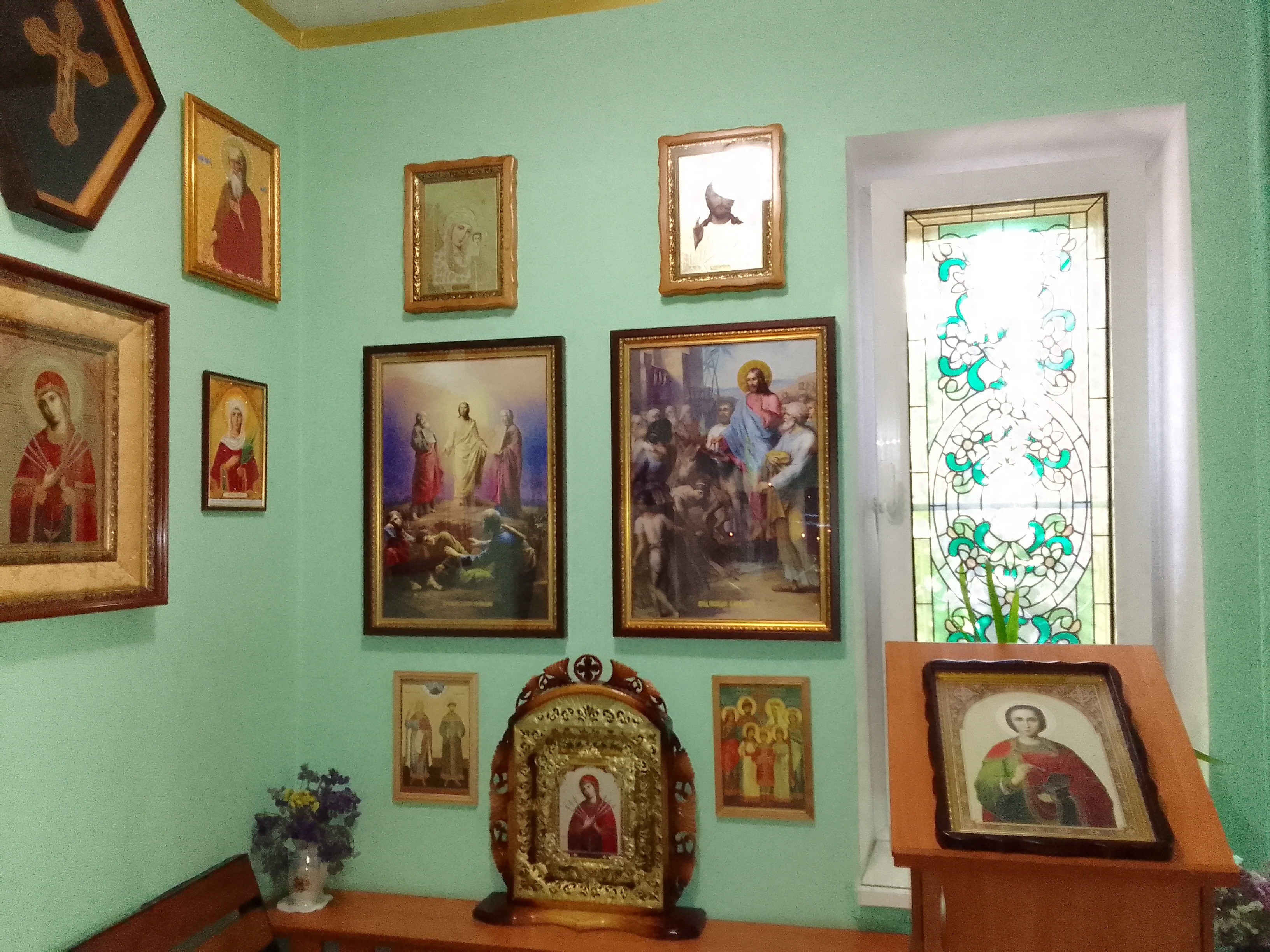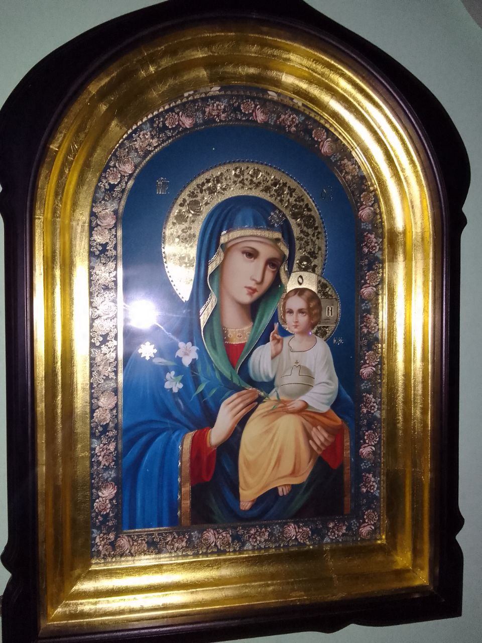 Икона Пресвятой Богородицы «Неувядаемый Цвет» выполнена в деревянном кивоте со стрельчатой верхом. Располагается напротив иконостаса. Подарена жителями Донецка.