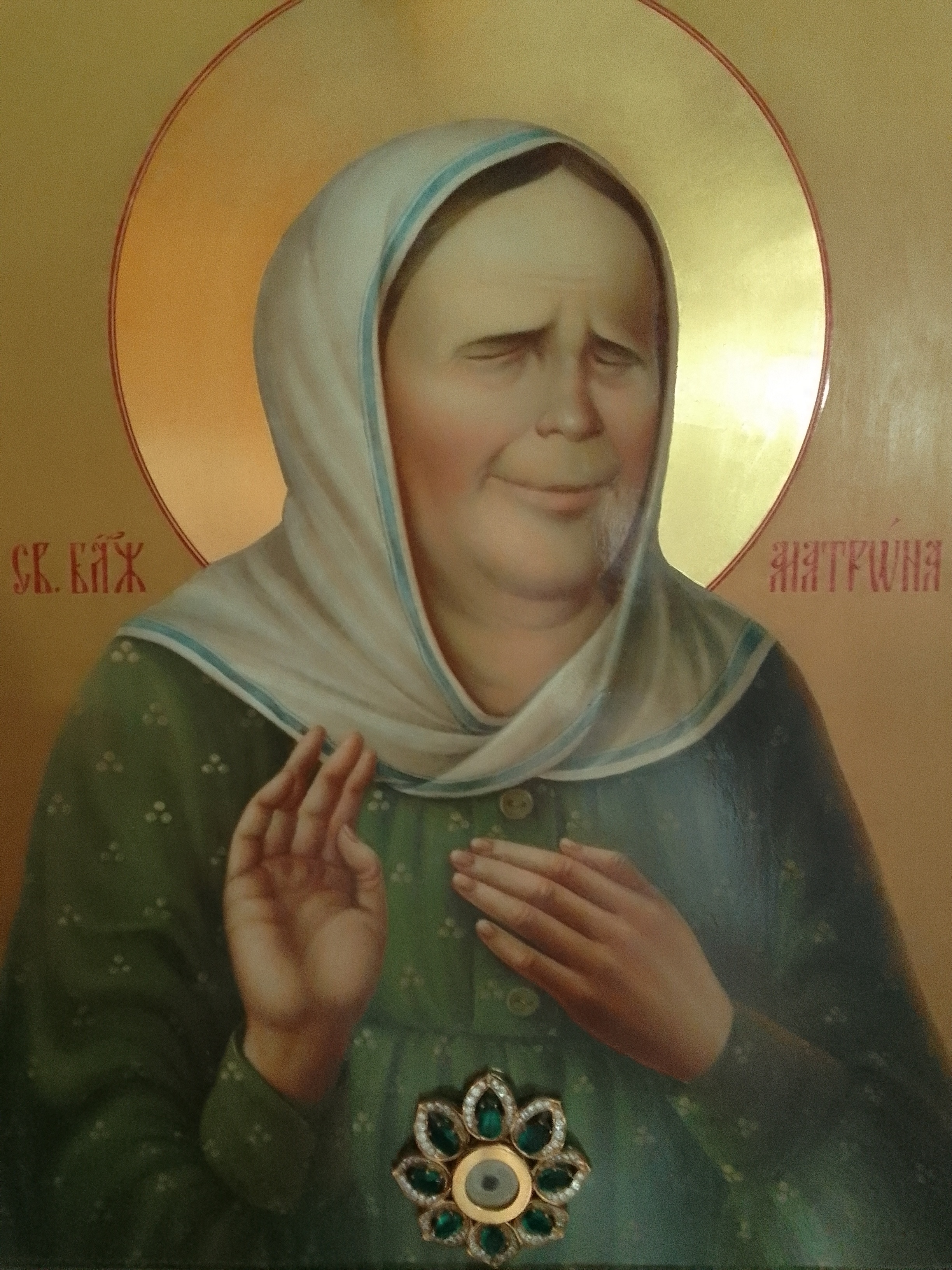 Икона святой блаженной Матроны Московской с частичкой мощей, написана в Свято-Троицкой Лавре искусными мастерами. Располагается с правой стороны от иконостаса в деревянном окладе. В памятной книге зафиксированы многие чудеса (исцеление болящих, помощь в бедах и в рождение детей) совершившиеся по молитвам к святой Матроне. Каждую неделю в храме совершается молебен перед иконой святой Матроны.